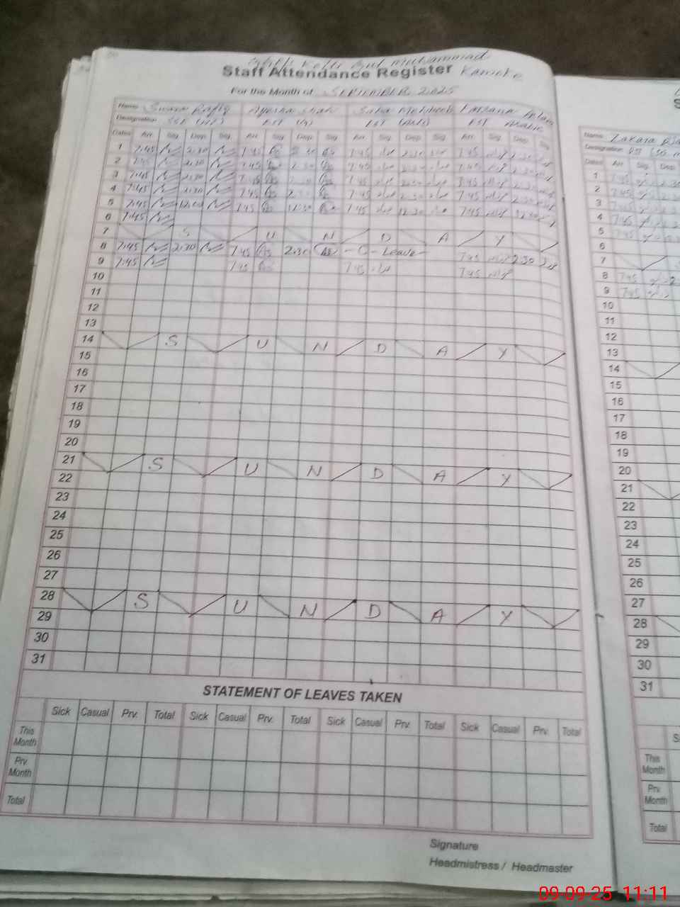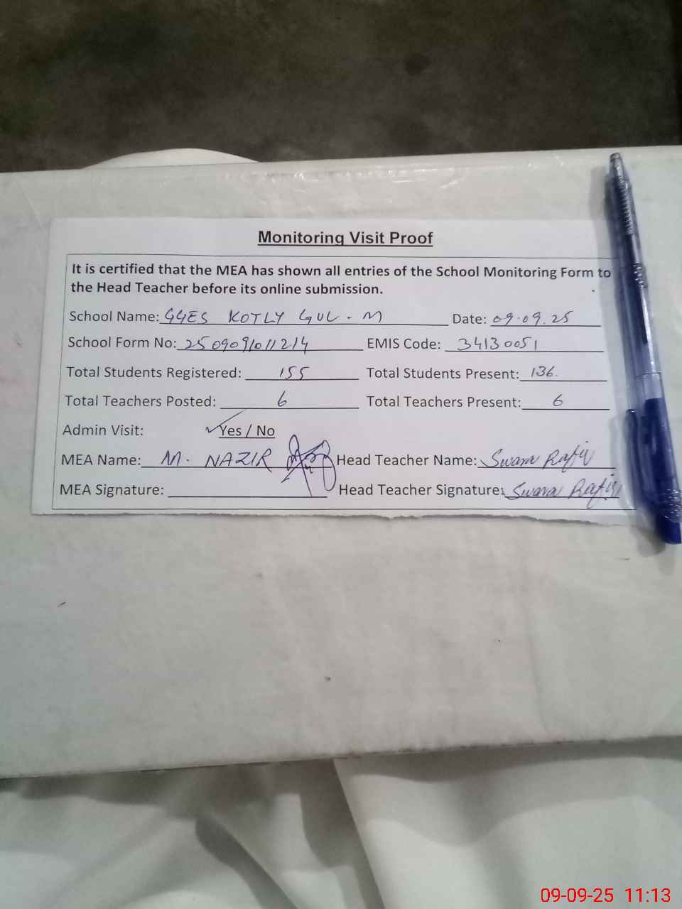 | Attendance Register | Head Teacher | MEA with School | Visit Proof |