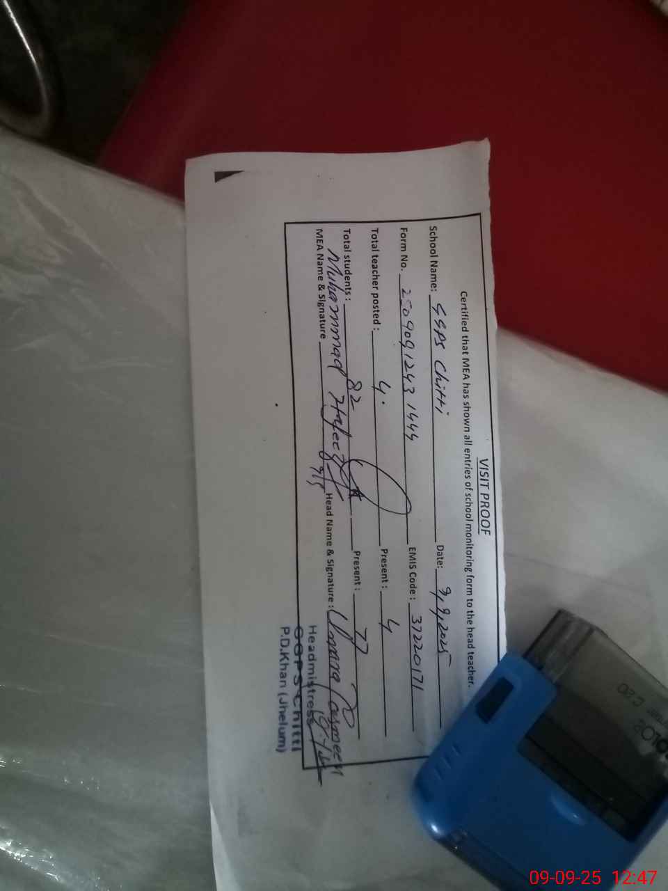 | Attendance Register | Head Teacher | MEA with School | Visit Proof |
