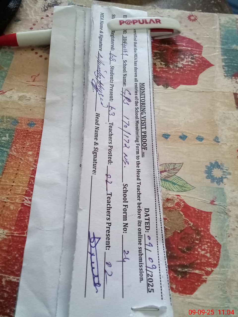 | Attendance Register | Head Teacher | MEA with School | Visit Proof |