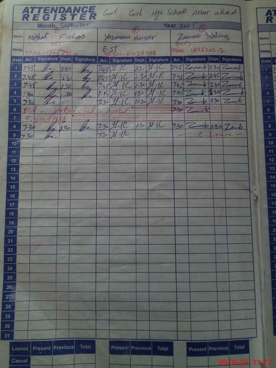 | CNIC | Full Name | Designation | R/C | Absence During Last Calender Month |