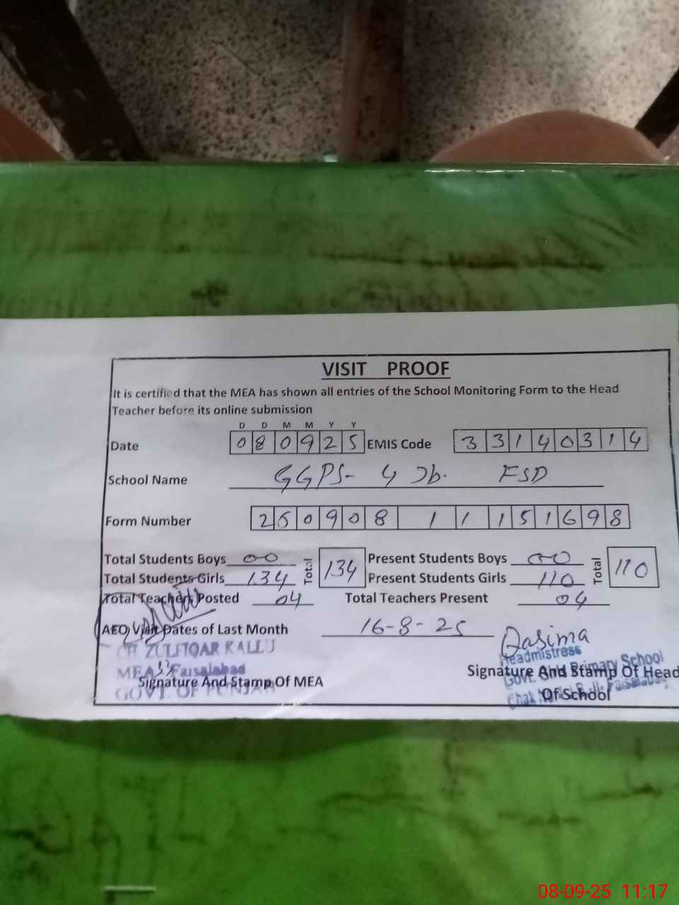 | EMIS Code: 33140314 | Name of School: GGPS chak 4 JB | |||