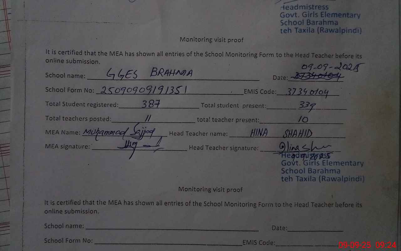 | Monitoring Date: 09-09-2025 | Start Time: 09-09-2025 08:28 AM | End Time: 09-09-2025 09:25 AM | Name of MEA: Mu**** Sa**** | |
