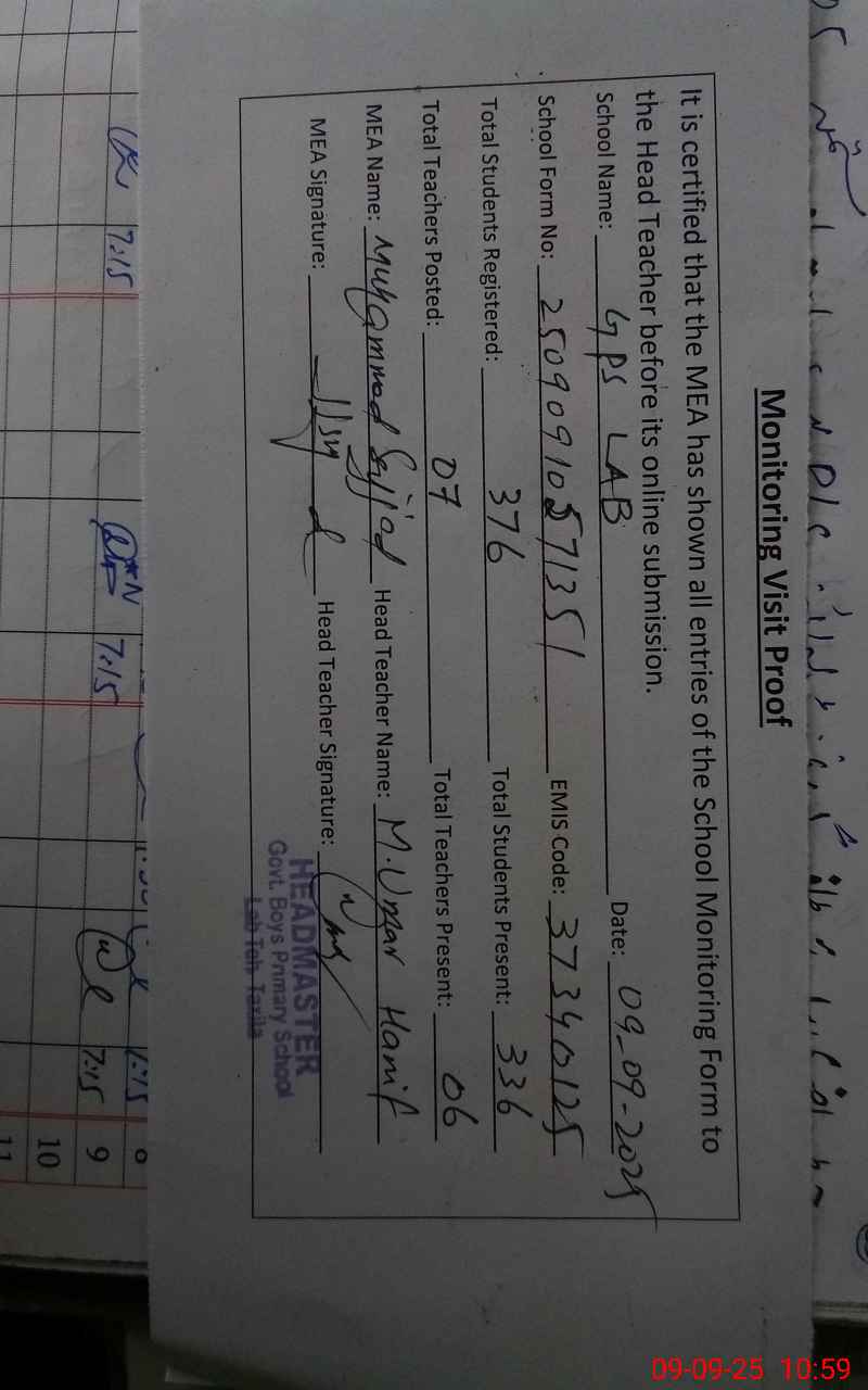 | Attendance Register | Head Teacher | MEA with School | Visit Proof |