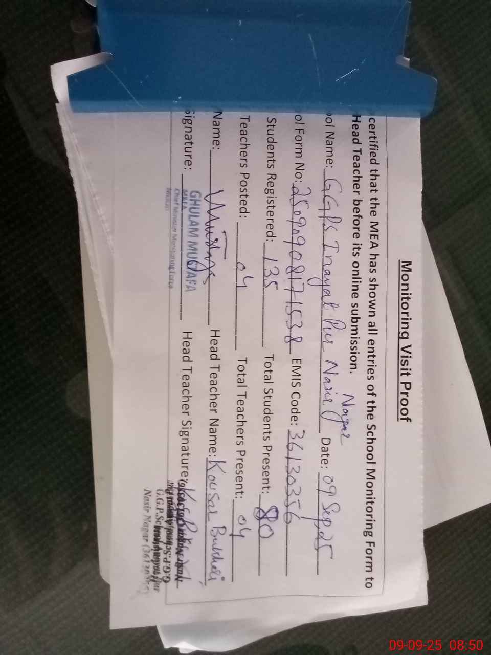 | Attendance Register | Head Teacher | MEA with School | Visit Proof |