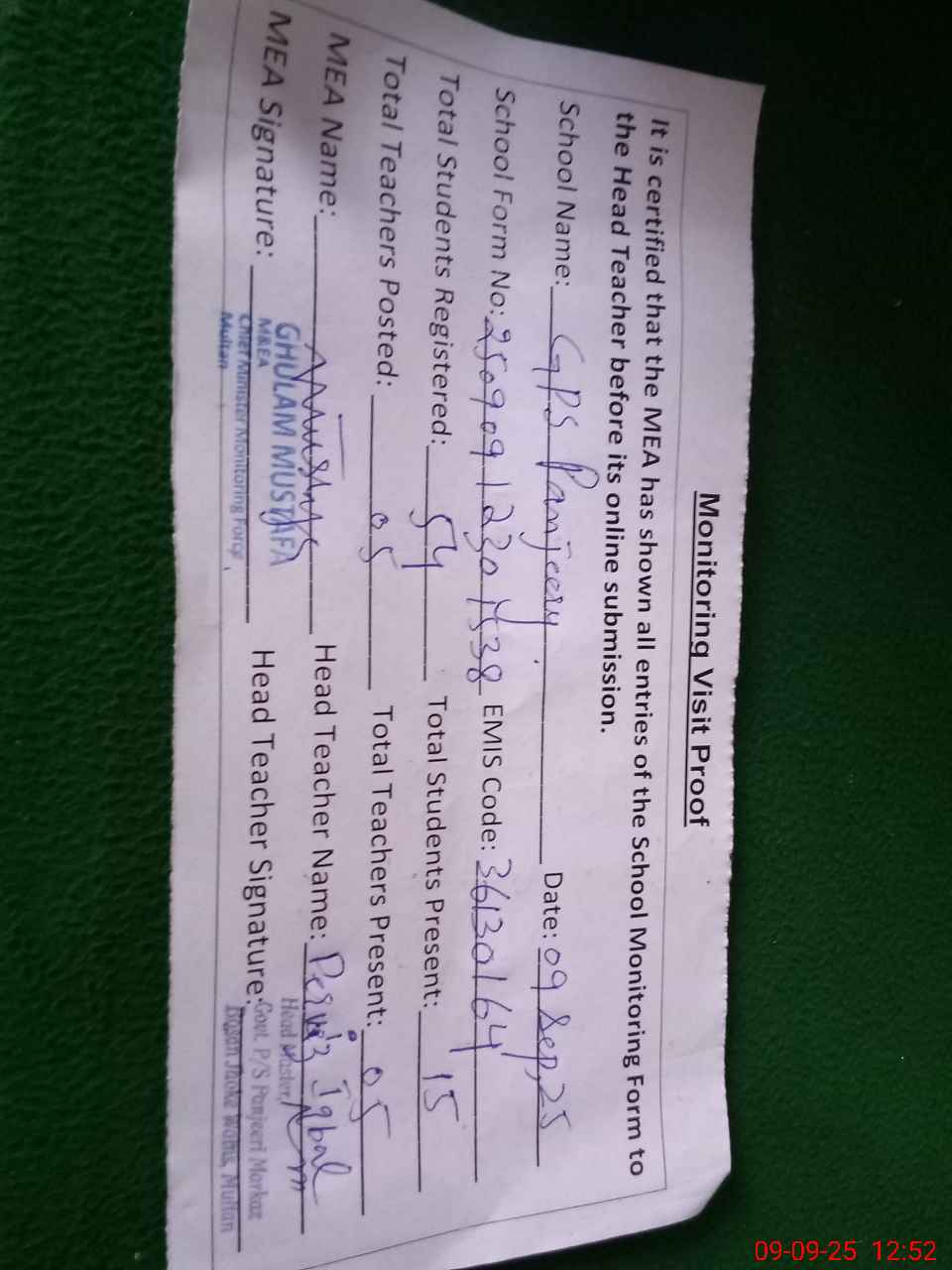 | EMIS Code: 36130164 | Name of School: GPS PANJEERY P/O JHOKE WAINS MULTAN | |||