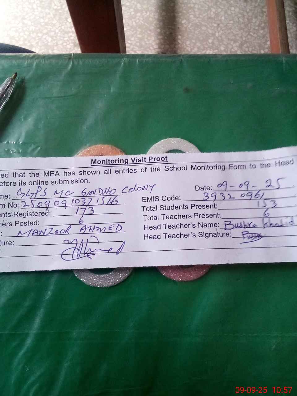 | Attendance Register | Head Teacher | MEA with School | Visit Proof |