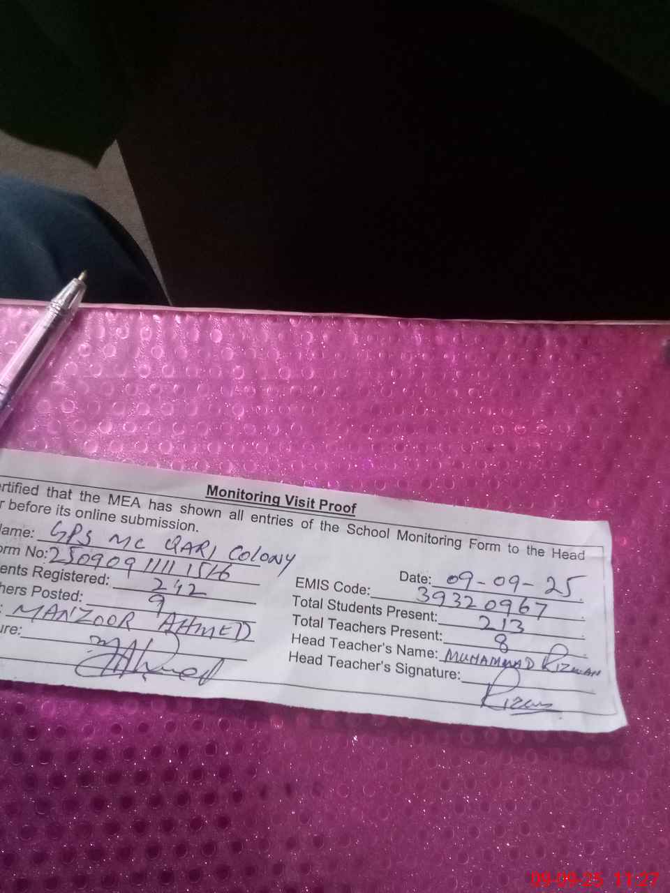 | EMIS Code: 39320967 | Name of School: GPS MC QARI COLONY | |||