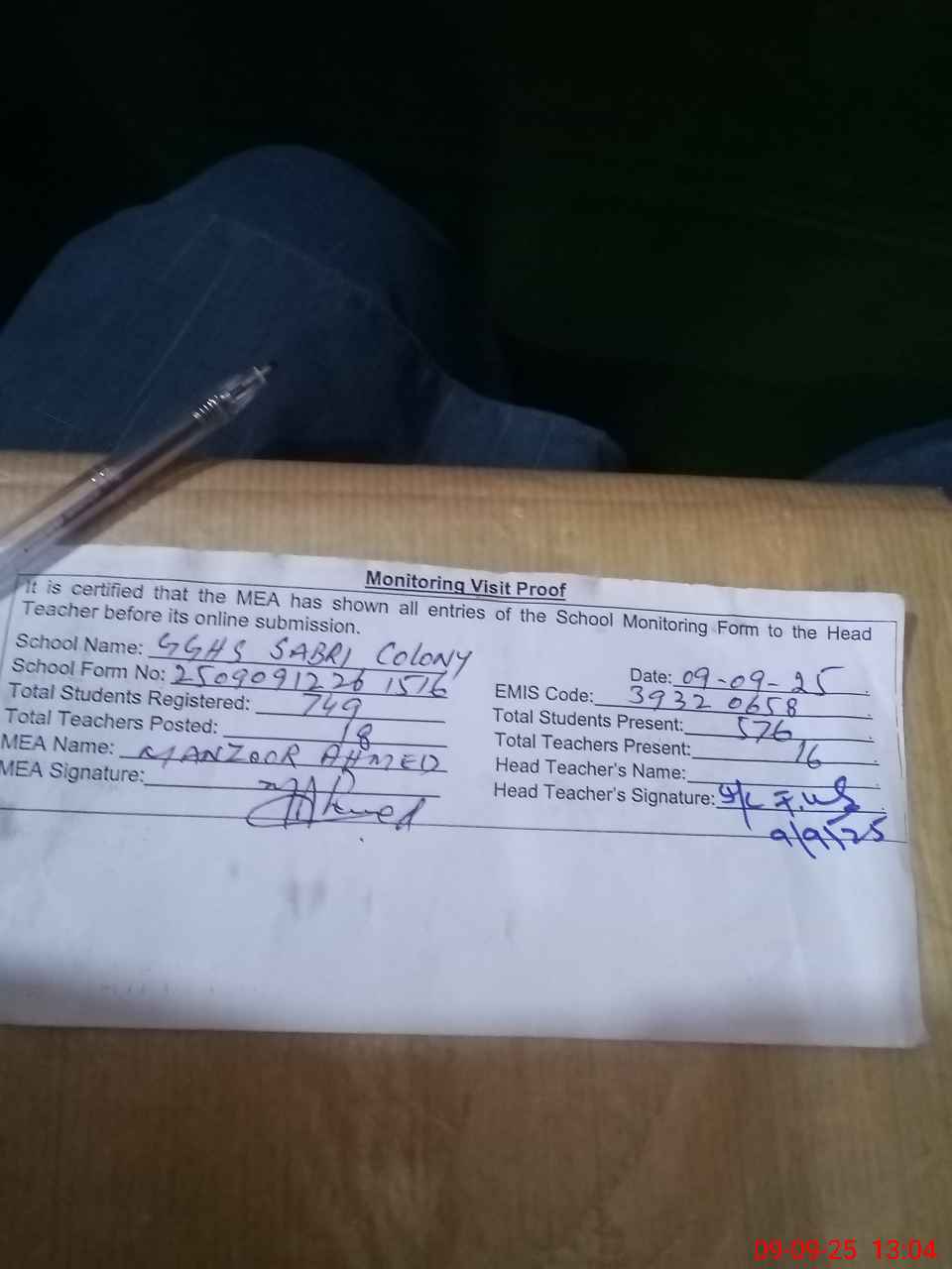 | Attendance Register | Head Teacher | MEA with School | Visit Proof |