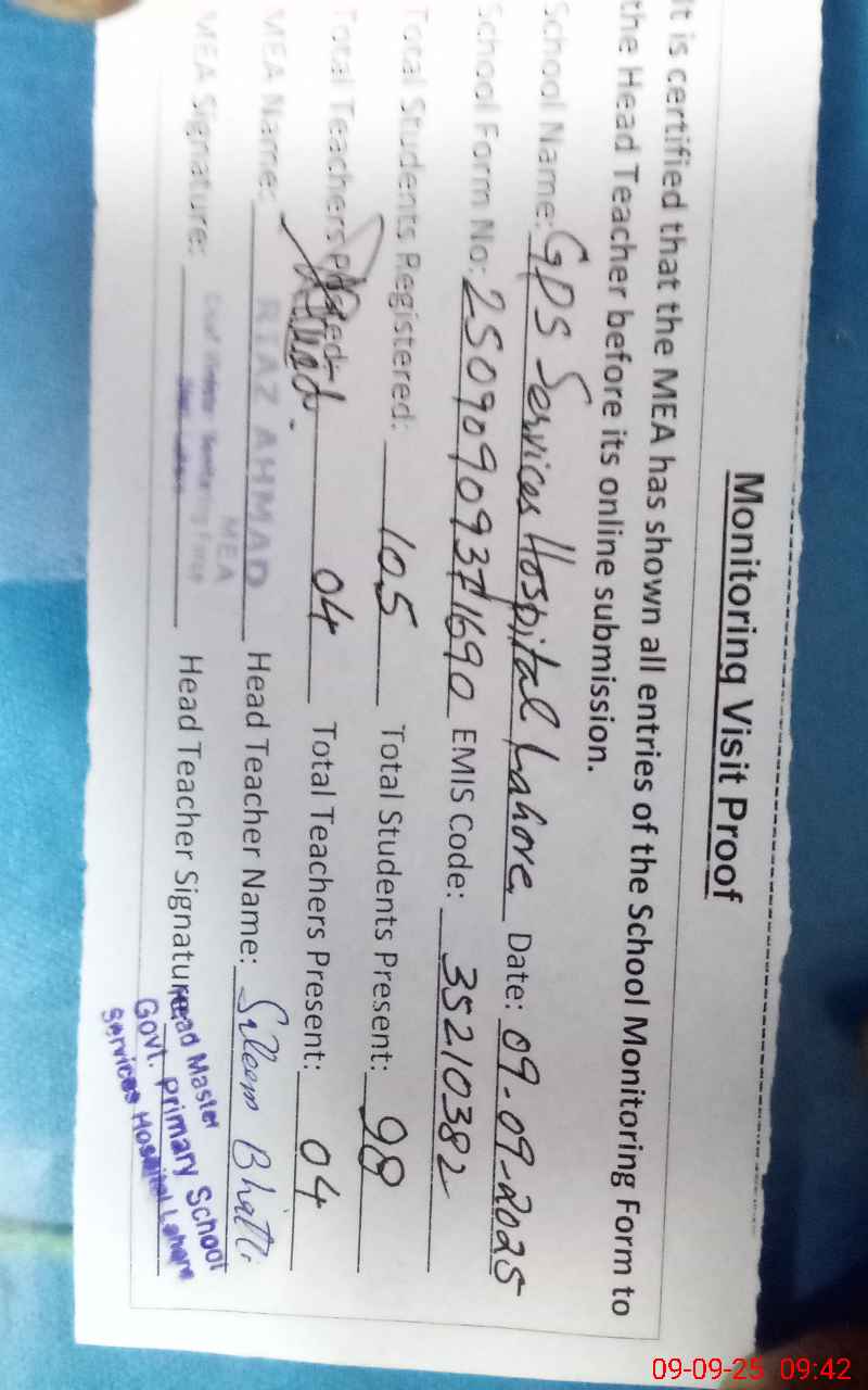 | EMIS Code: 35210382 | Name of School: GPS SERVICES HOSPITAL LHR | |||