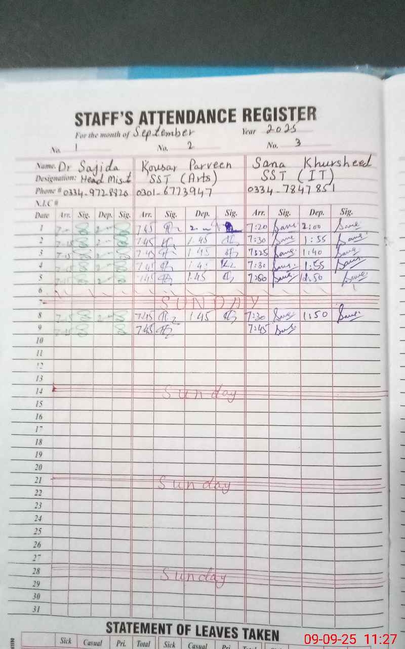 | Remarks (Use Separate Page if Required): Teacher Tasnim kauser retired from service since 17 August 2024 still showing on teachers list NQ Amir Ali cnic 4230152517217 is attached with SED There is no proof available after October 2022 So mark him absent as school head teacher has no whereabout of Amir Ali Five class rooms required repair and maintenance because recent rains cause seepage also effected these rooms | |||||