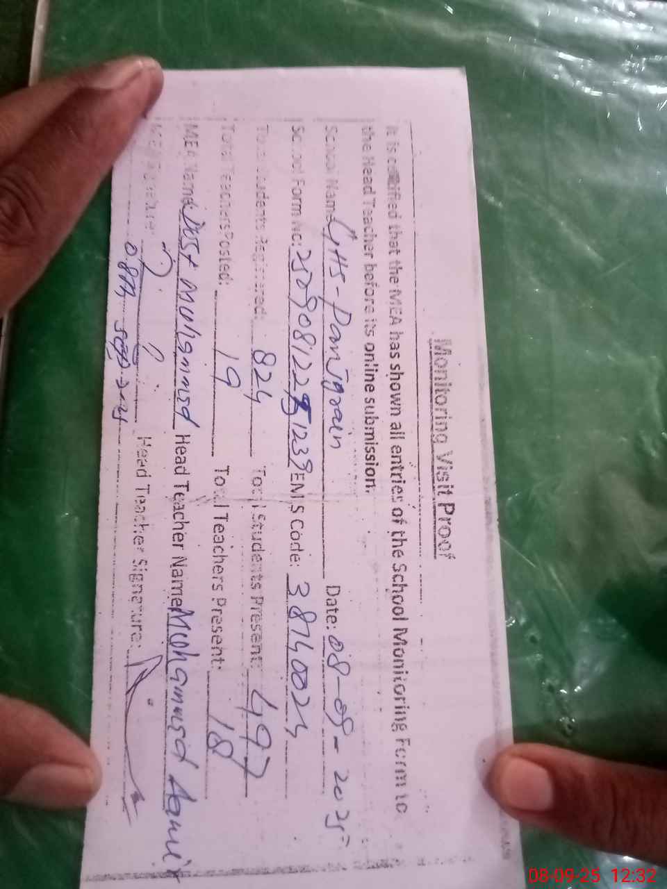 | Attendance Register | Head Teacher | MEA with School | Visit Proof |