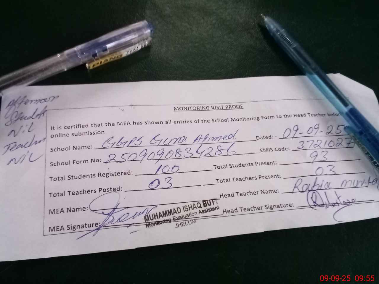 | Attendance Register | Head Teacher | MEA with School | Visit Proof |