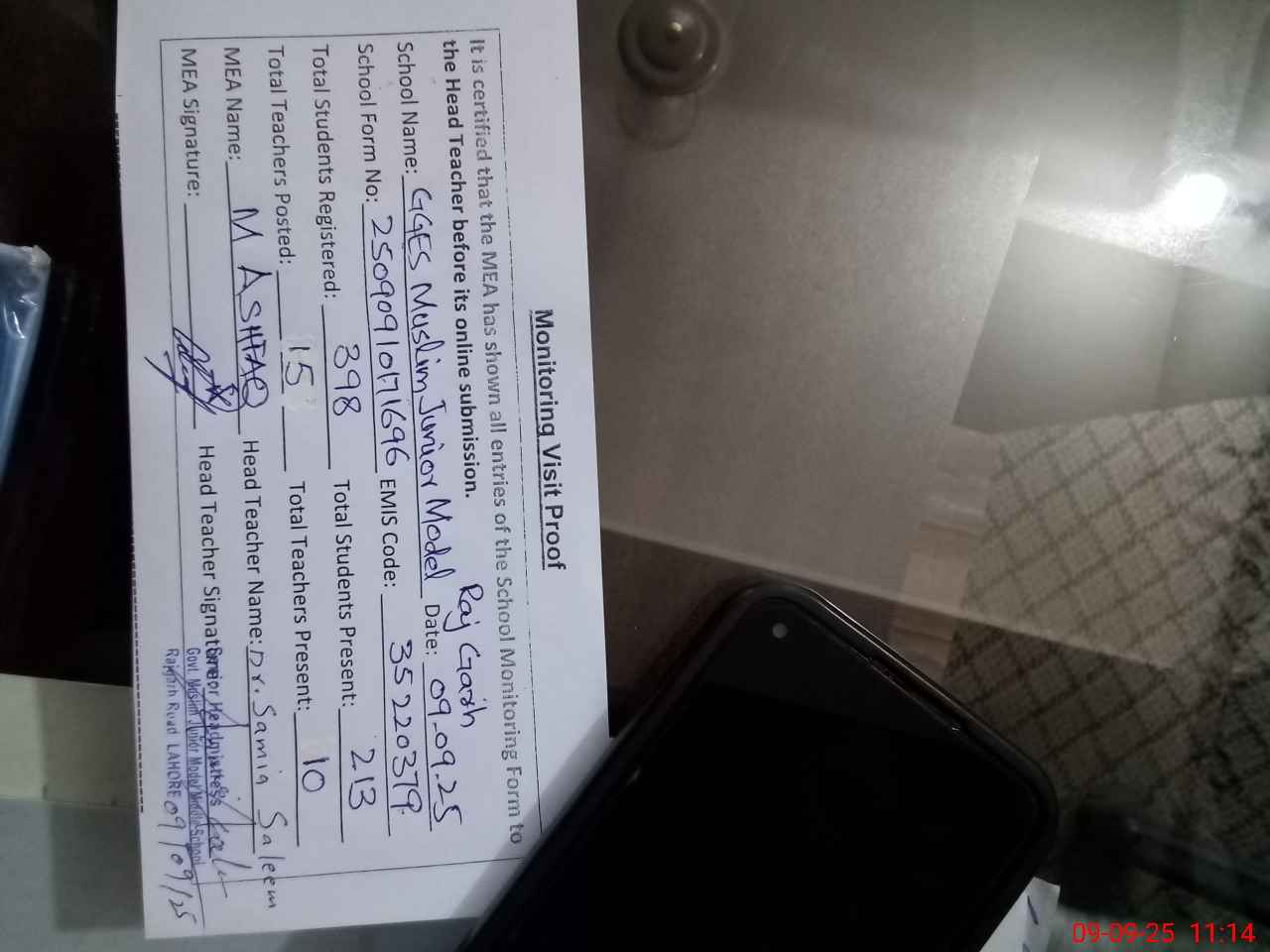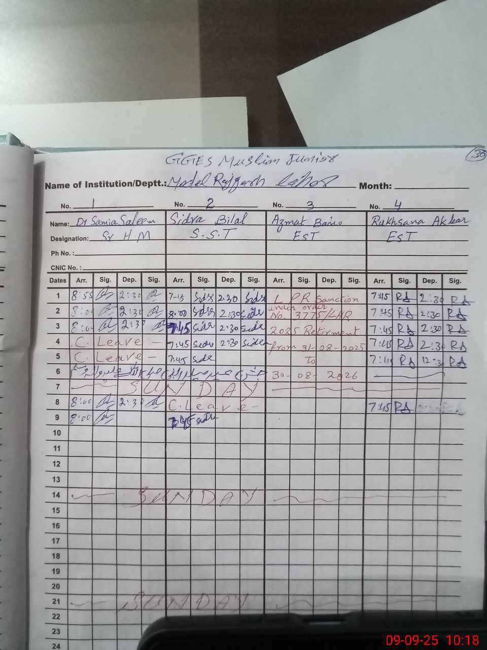 | Remarks (Use Separate Page if Required): EST Aisha Siddiq and EST Sarah Khurshed attached other schools but their latest orders not available so mark them absent NSB register not updated for the month of August 25 Security Guard Saleem Ahmad attached here 05 rooms looking so old and bad condition and not in use 35220379 | |||||