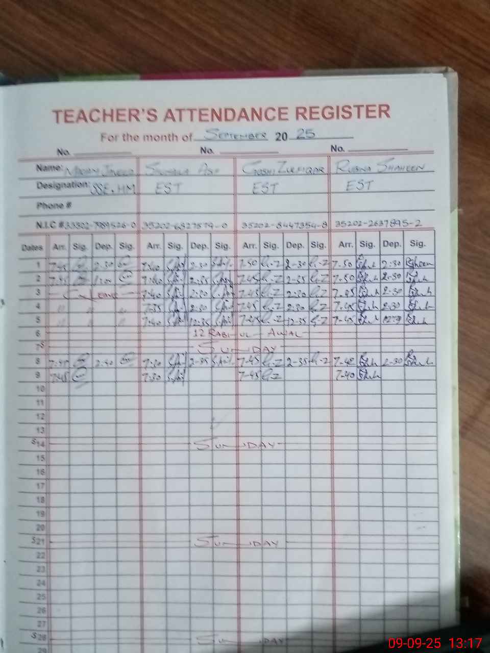 | CNIC | Full Name | Designation | R/C | Absence during last cal. month | Leave Type | Remarks for today (Leave,Training, Exam,Absent,Late, Other duty) | |||||||
