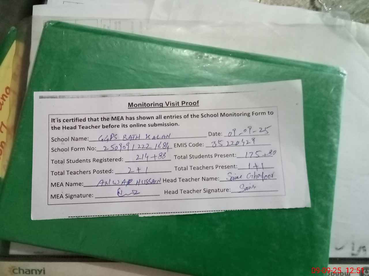| EMIS Code: 35220429 | Name of School: GGPS BATH KALAN MULTAN ROAD | |||