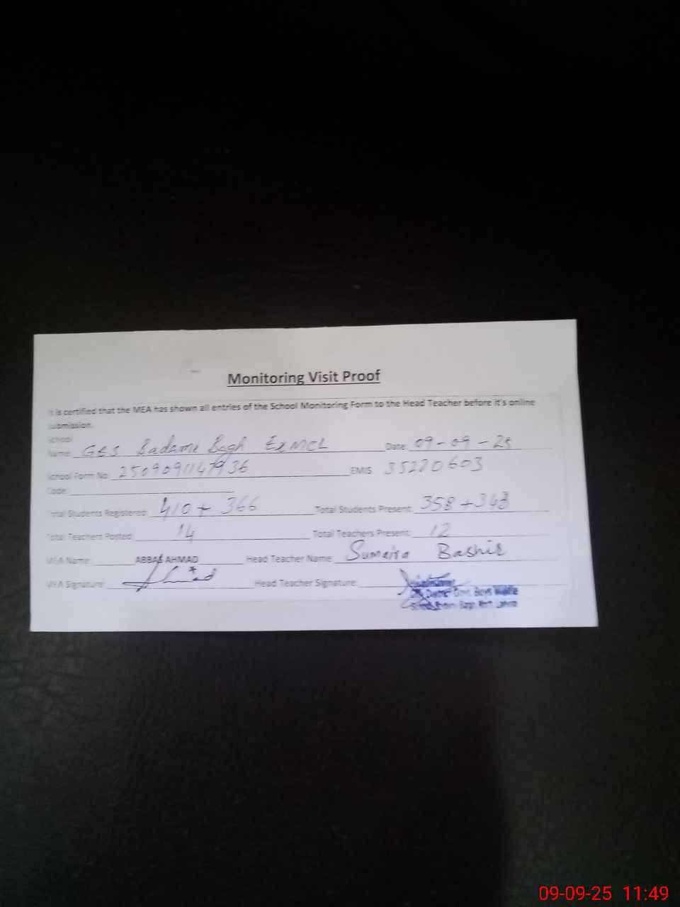 | Certified that this School was Inspected by the Undersigned MEA/DMO Today and the Information Stated Above is as Per Record. | |||||