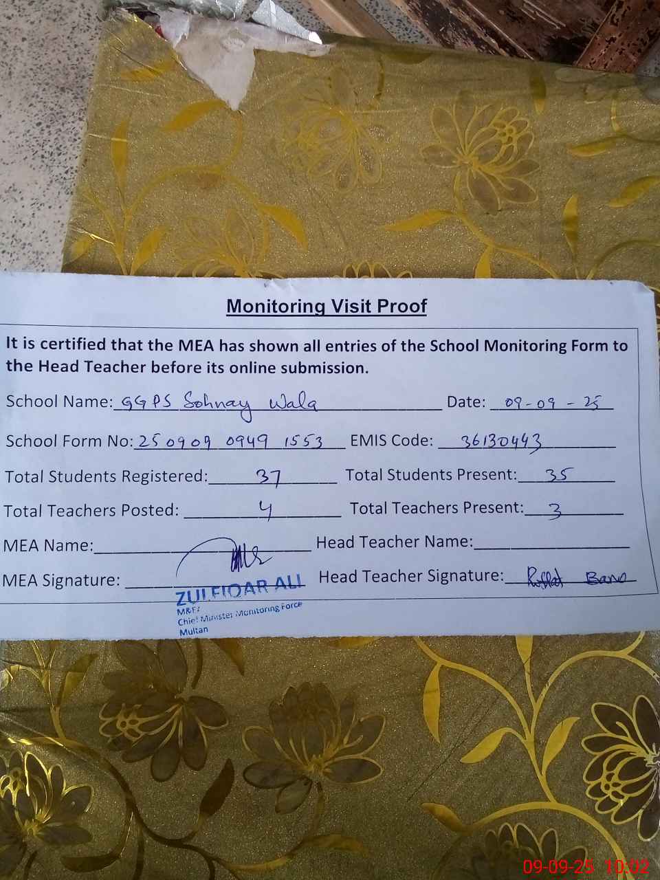 | Monitoring Date: 09-09-2025 | Start Time: 09-09-2025 09:49 AM | End Time: 09-09-2025 10:06 AM | Name of MEA: Zu**** Al**** | |