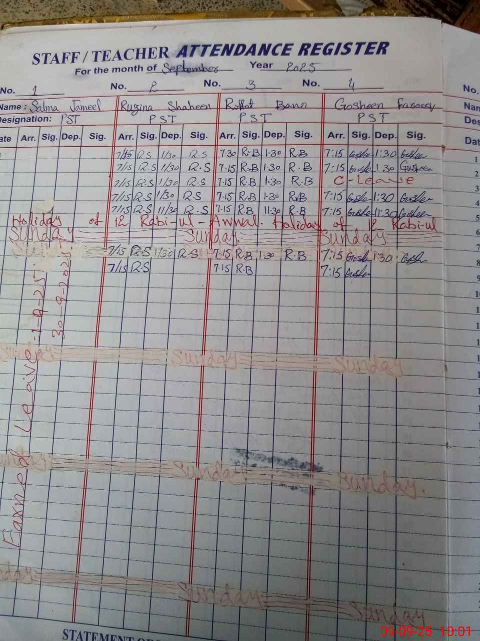 | CNIC | Full Name | Designation | R/C | Absence During Last Calender Month |