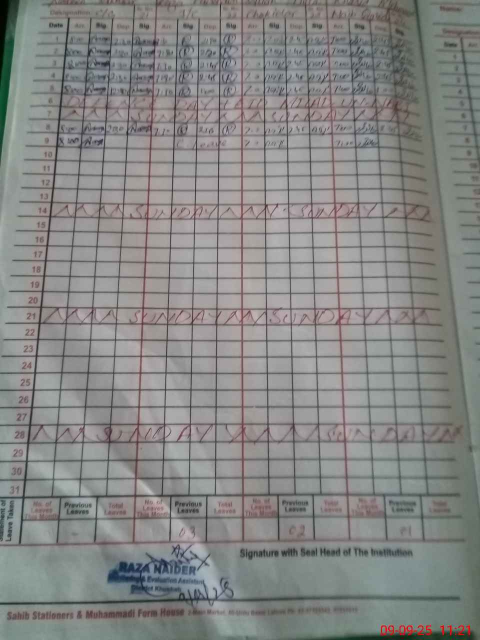 | CNIC | Full Name | Designation | R/C | Absence During Last Calender Month |