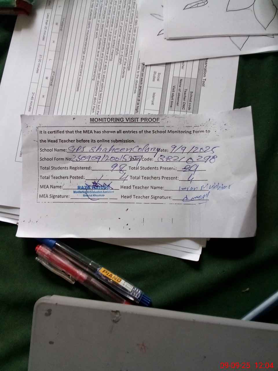 | EMIS Code: 38210298 | Name of School: GPS SHAHEEN COLONY | |||