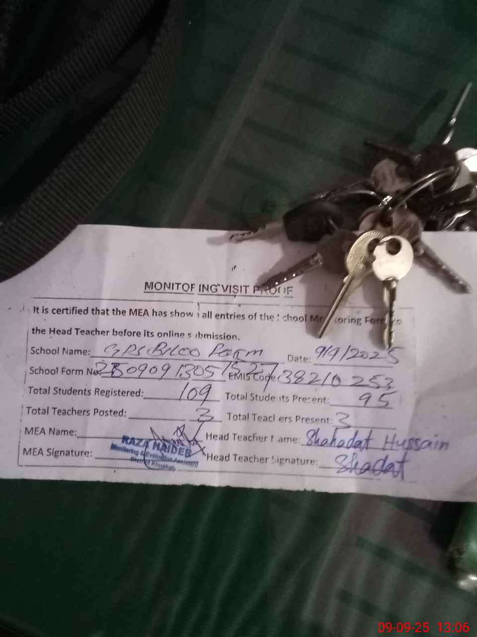 | Attendance Register | Head Teacher | MEA with School | Visit Proof |