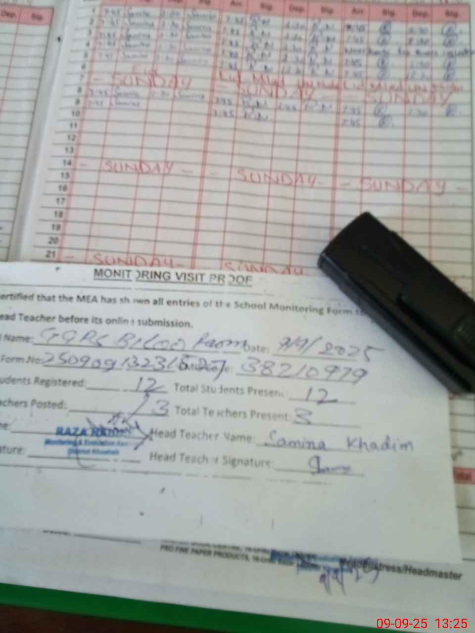 | Attendance Register | Head Teacher | MEA with School | Visit Proof |