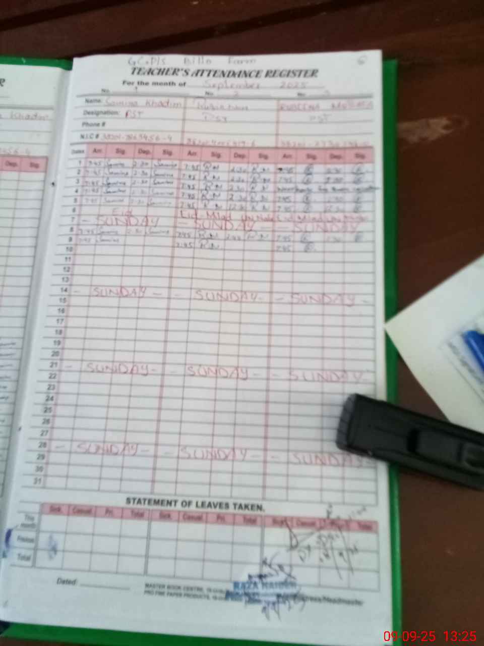 | CNIC | Full Name | Designation | R/C | Absence During Last Calender Month |