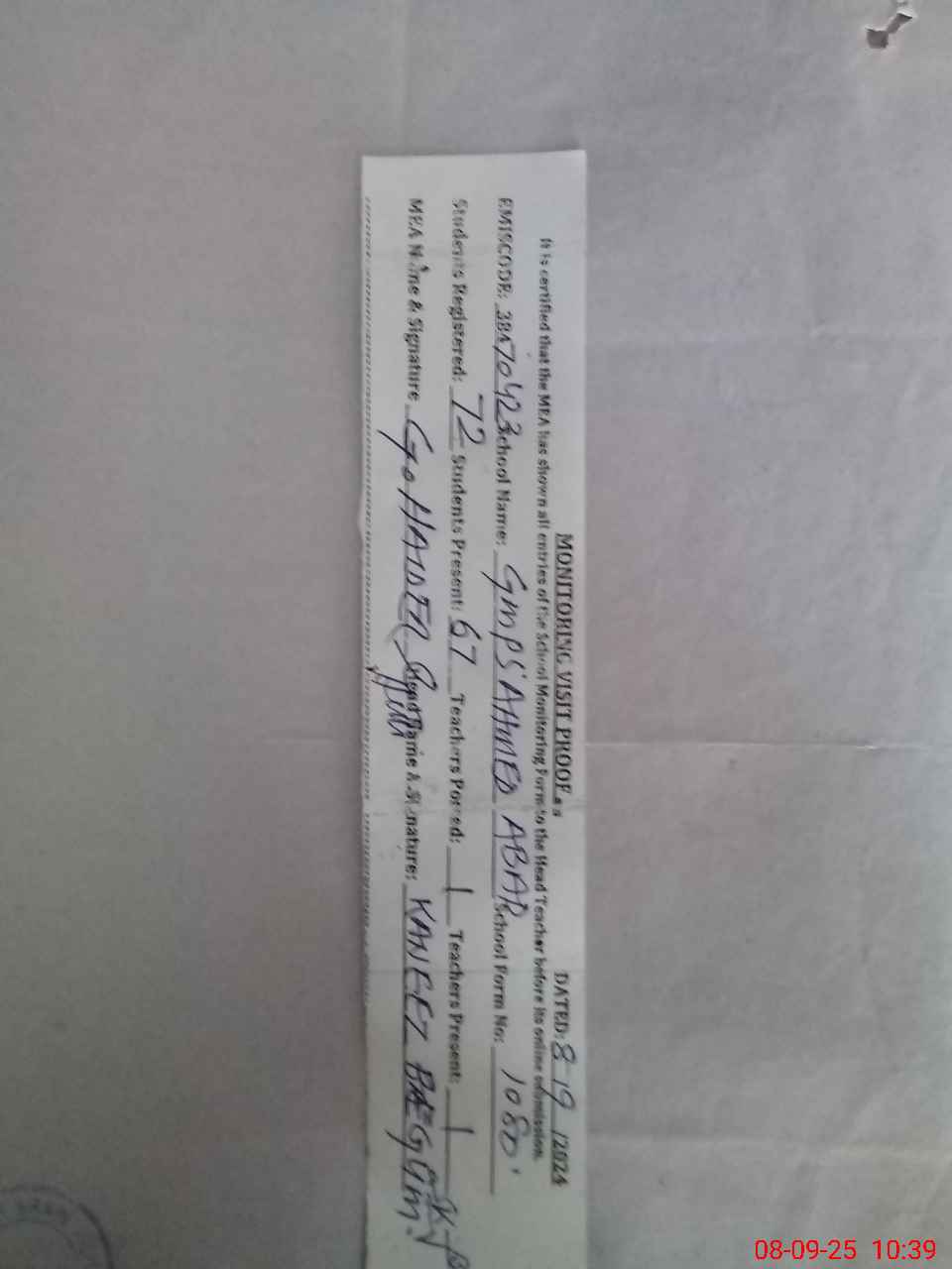 | Monitoring Date: 08-09-2025 | Start Time: 08-09-2025 10:30 AM | End Time: 08-09-2025 11:10 AM | Name of MEA: GH**** HA**** | |