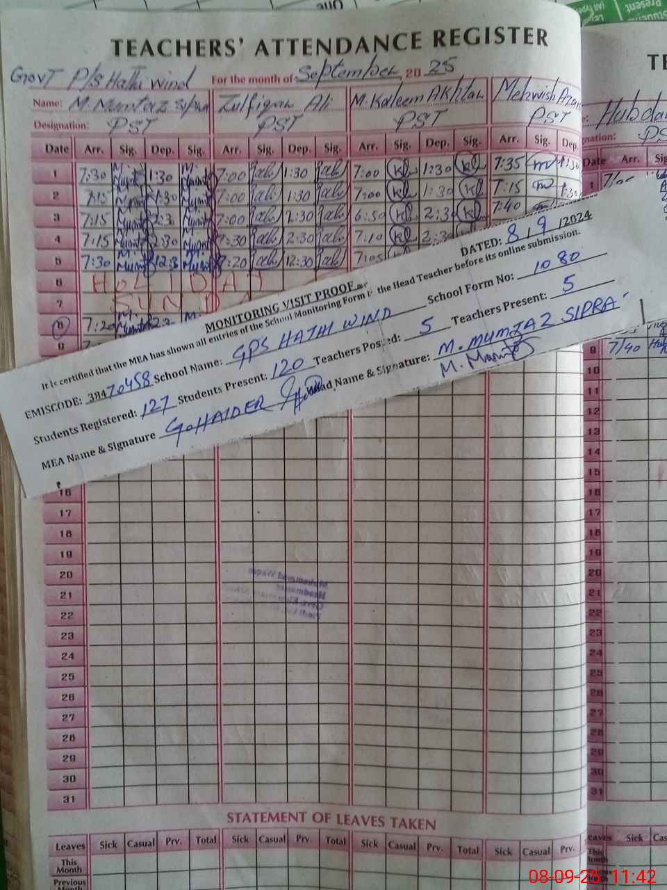 | Attendance Register | Head Teacher | MEA with School | Visit Proof |
