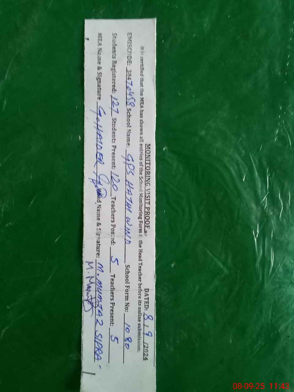 | Monitoring Date: 08-09-2025 | Start Time: 08-09-2025 11:30 AM | End Time: 08-09-2025 11:57 AM | Name of MEA: GH**** HA**** | |