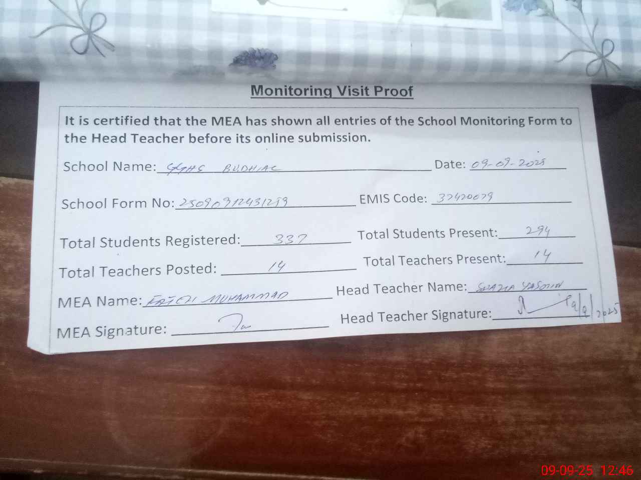 | Attendance Register | Head Teacher | MEA with School | Visit Proof |