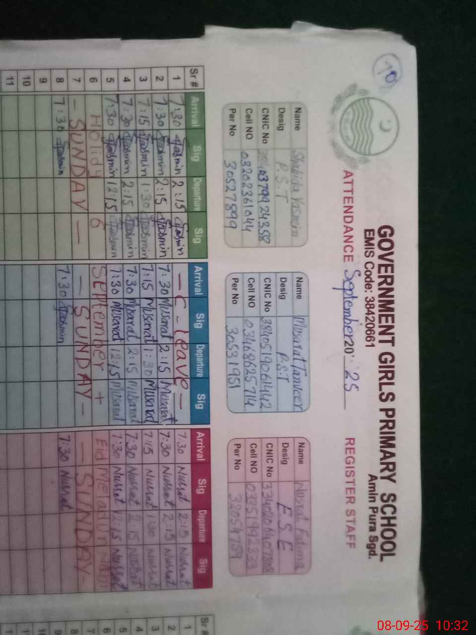 | CNIC | Full Name | Designation | R/C | Absence During Last Calender Month |