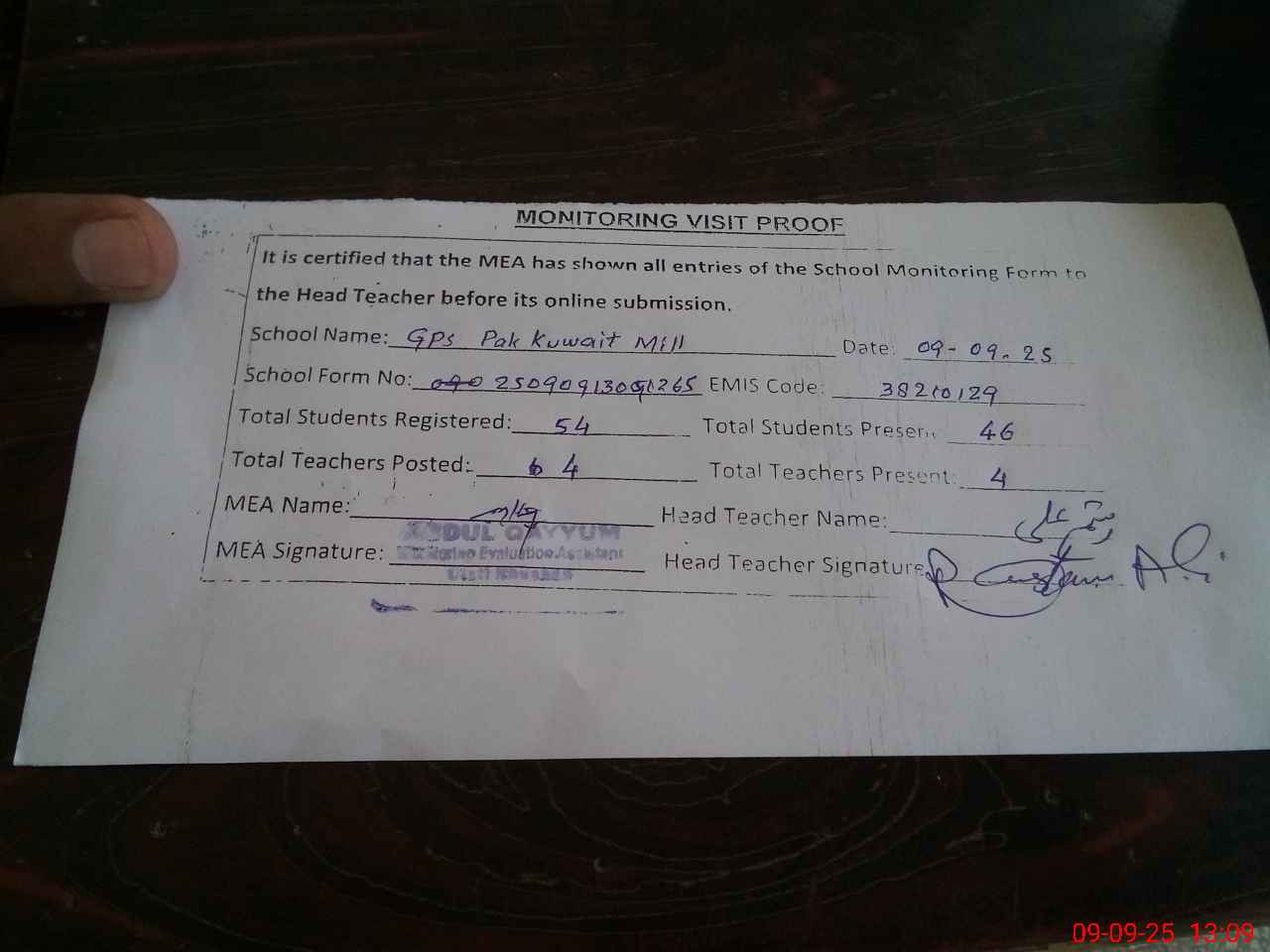 | Attendance Register | Head Teacher | MEA with School | Visit Proof |