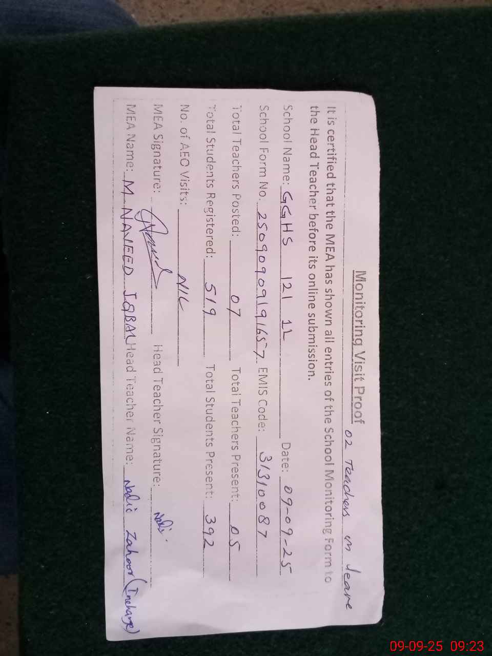 | Attendance Register | Head Teacher | MEA with School | Visit Proof |