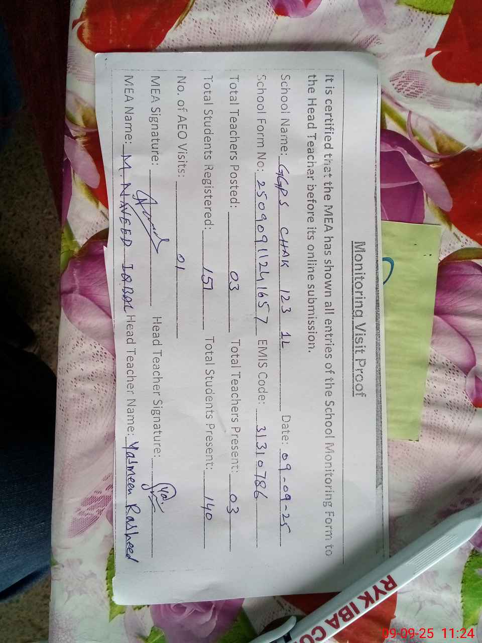| Attendance Register | Head Teacher | MEA with School | Visit Proof |