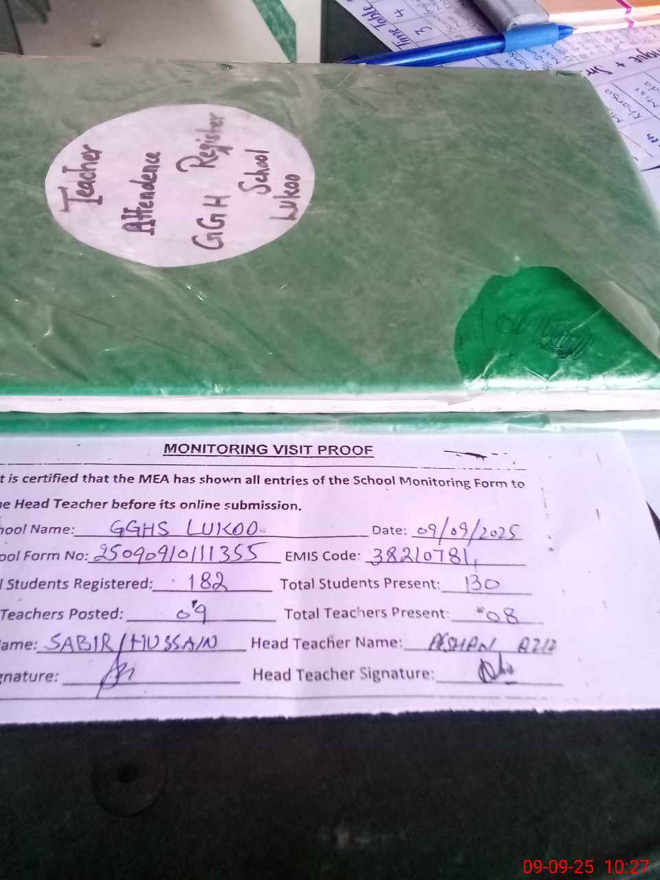 | Attendance Register | Head Teacher | MEA with School | Visit Proof |