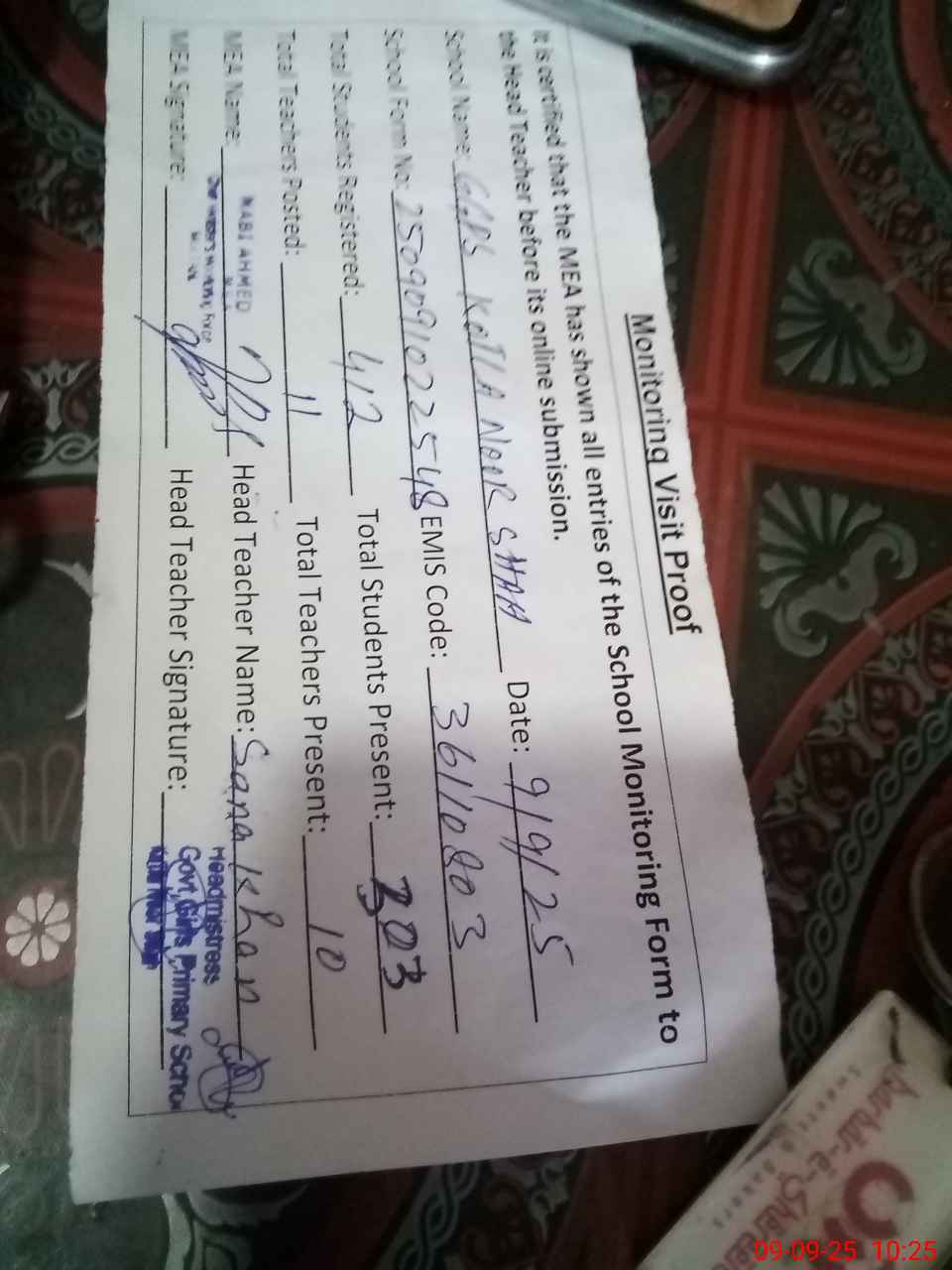 | Attendance Register | Head Teacher | MEA with School | Visit Proof |