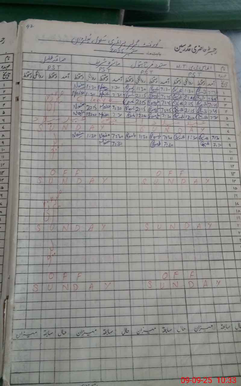 | Remarks (Use Separate Page if Required): Teacher Miara Sharif PST in class with little baby without Aya Students attendance 49 percent present NSB record not maintain after June 2025 Code 35210497 | |||||