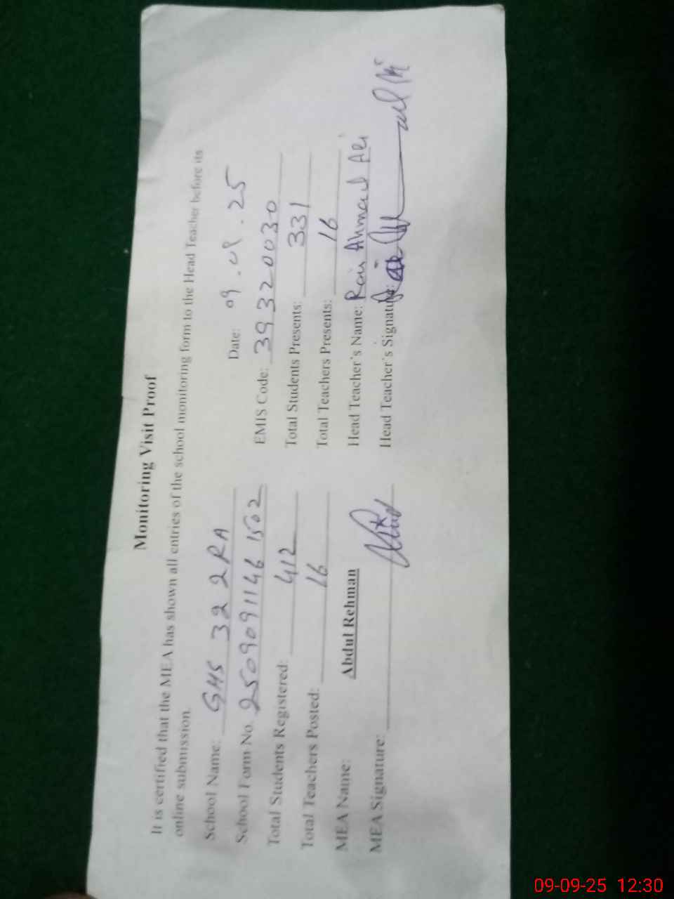 | Attendance Register | Head Teacher | MEA with School | Visit Proof |