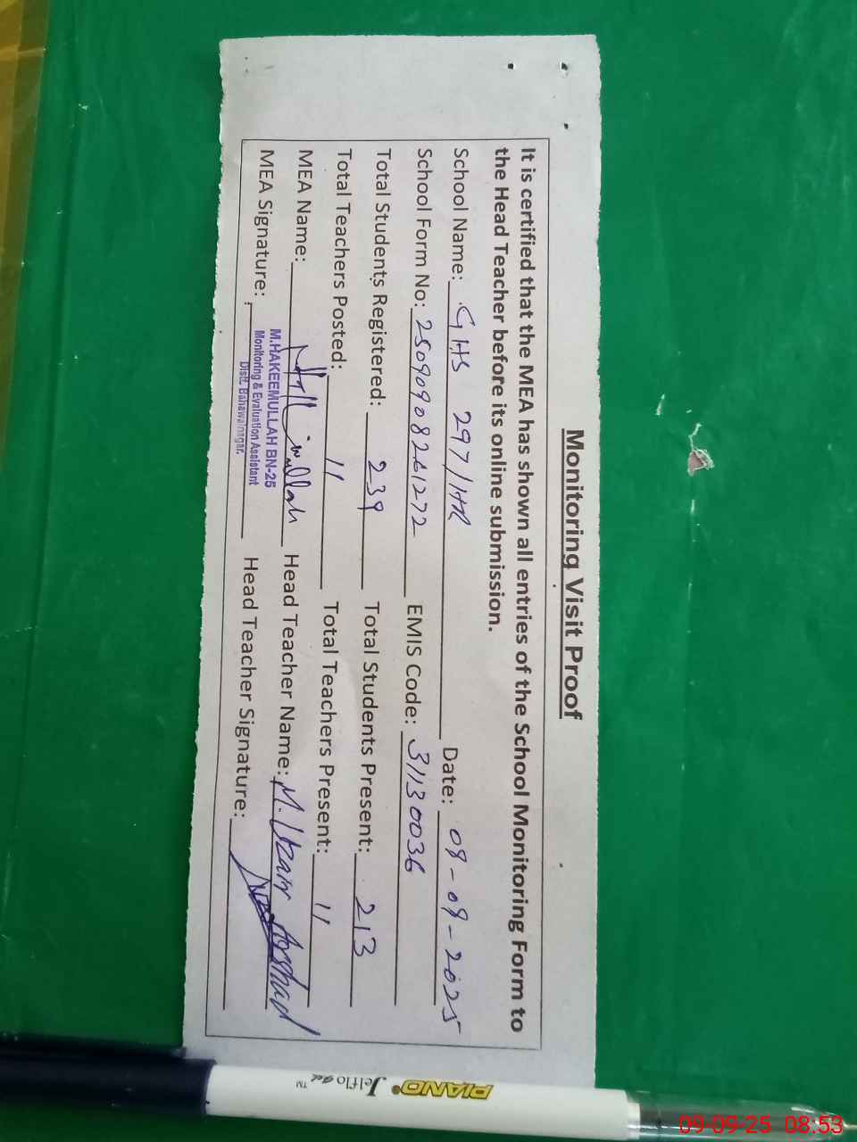 | Monitoring Date: 09-09-2025 | Start Time: 09-09-2025 08:26 AM | End Time: 09-09-2025 08:54 AM | Name of MEA: Mu**** ha**** ul**** BN25 | |
