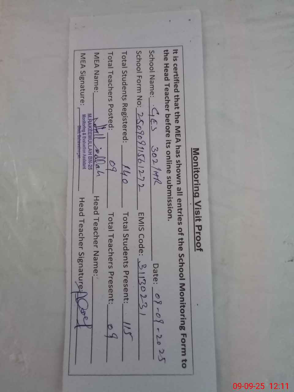 | EMIS Code: 31130231 | Name of School: GES CHAK NO 302 HR | |||