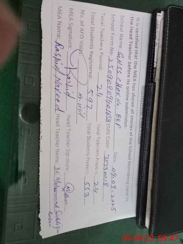 | Attendance Register | Head Teacher | MEA with School | Visit Proof |