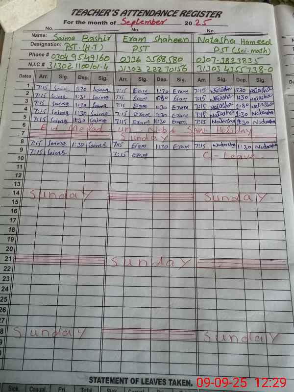 | CNIC | Full Name | Designation | R/C | Absence During Last Calender Month |