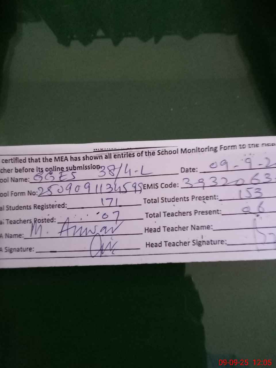 | Attendance Register | Head Teacher | MEA with School | Visit Proof |