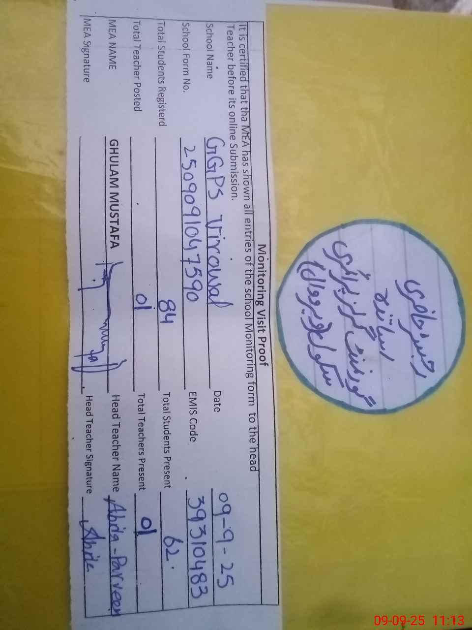 | Attendance Register | Head Teacher | MEA with School | Visit Proof |