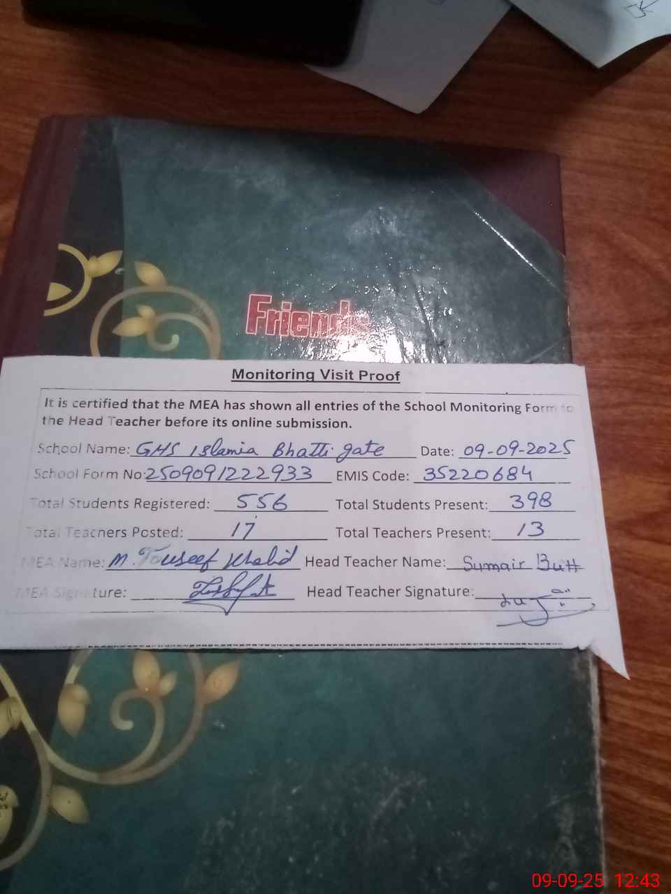 | EMIS Code: 35220684 | Name of School: GHS ISLAMIA BHATTI GATE | |||