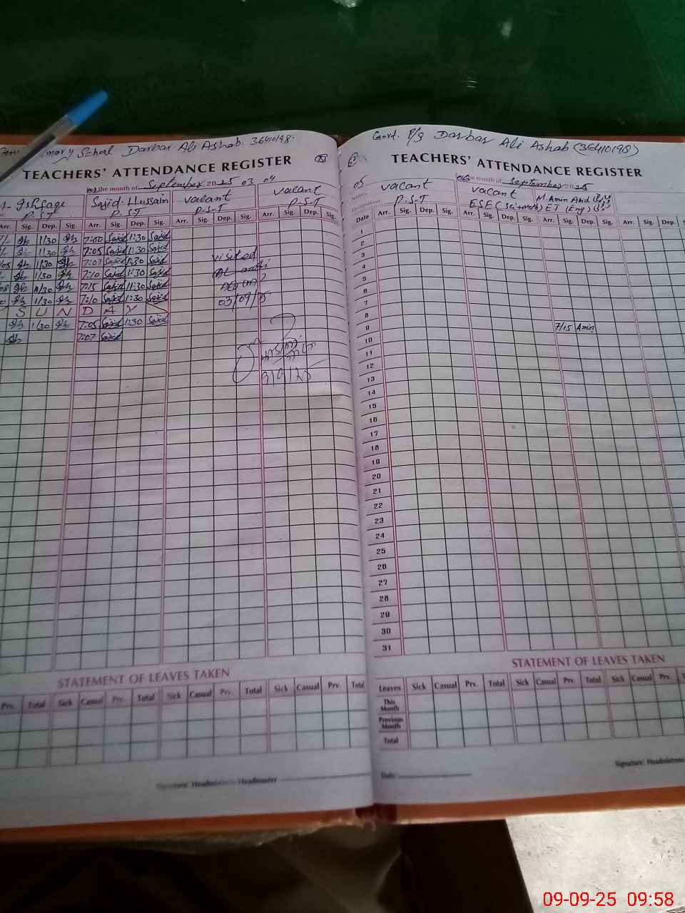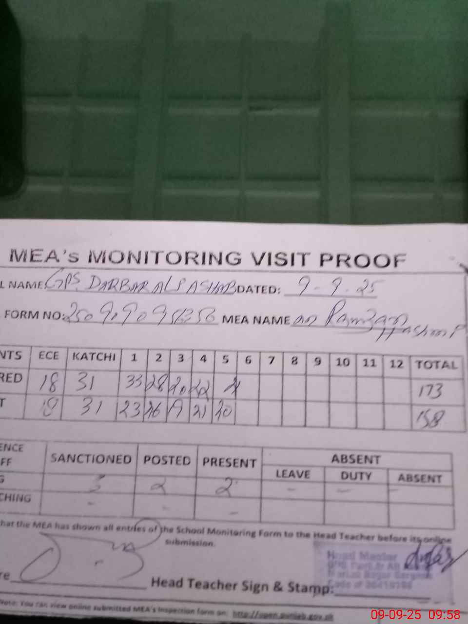 | Attendance Register | Head Teacher | MEA with School | Visit Proof |