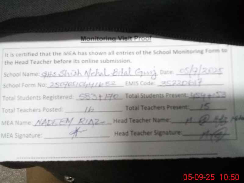 | EMIS Code: 35220617 | Name of School: GHS SHISH MEHAL BILAL GUNJ (EX-MCL) | |||