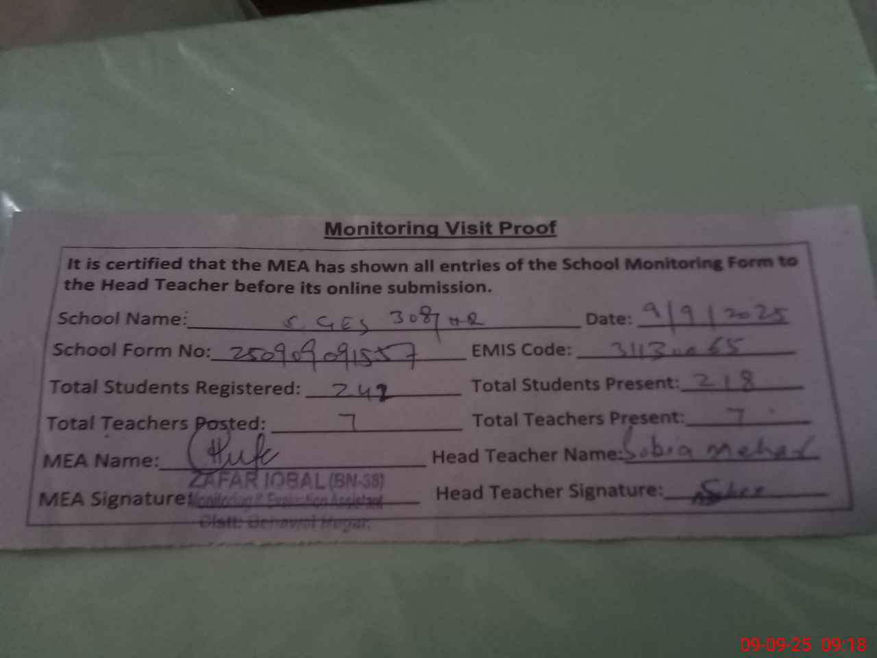 | EMIS Code: 31130065 | Name of School: GGES CHAK NO. 308 HR | |||