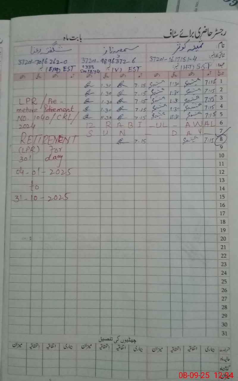 | CNIC | Full Name | Designation | R/C | Absence During Last Calender Month |